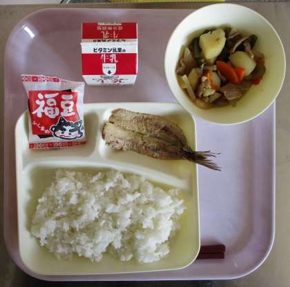 今日の教の給食では、節分の行事献立として「いわしのしょうがじょうゆかけ」と「いり大豆」です。節分の日には、病気や悪い出来事を追い払うために、「鬼は外、福は内」と言って豆まきをしたり、年の数だけいり大豆を食べたりする習慣があります。鬼が苦手ないわしの頭をヒイラギの枝に刺して、家の入り口に立てる習慣もあります。