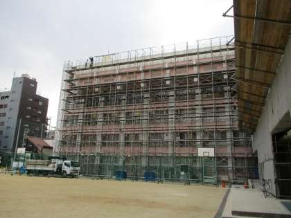 2月5日(水)外壁塗装工事の進行状況です。西館のグラウンド側の足場の解体が始まっています。シートも外されて、きれいに塗装された壁面があらわれました。
