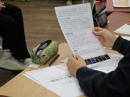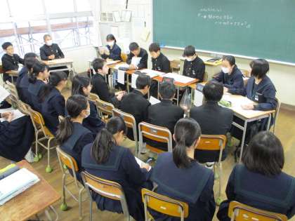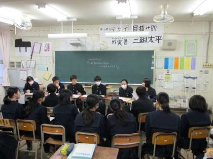2月6日(木)1限目、2年3組の国語の授業で、パネルディスカッションが行われました。冬休み課題で調べてきた「一番魅力的な方言は、どこの地方の方言か?」の内容を使っての授業です。流れ(約20分)は次の通りです。