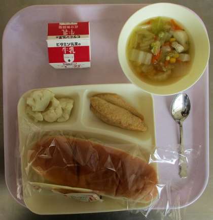 はくさいのスープ、カリフラワーのサラダ、スライスチーズ