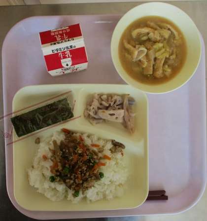鶏ごぼうご飯、牛乳、みそ汁、焼きれんこん、焼きのり