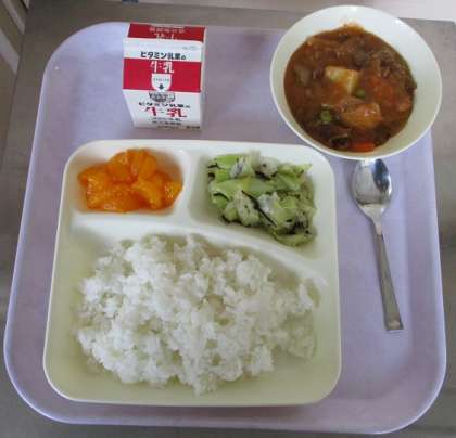 ハヤシライス、牛乳、キャベツのひじきドレッシング、みかん(缶)