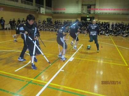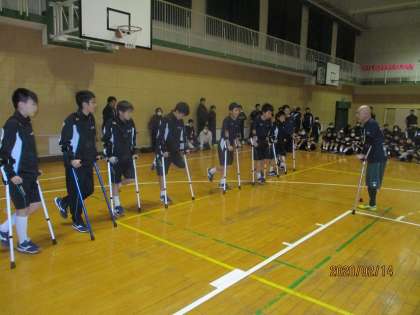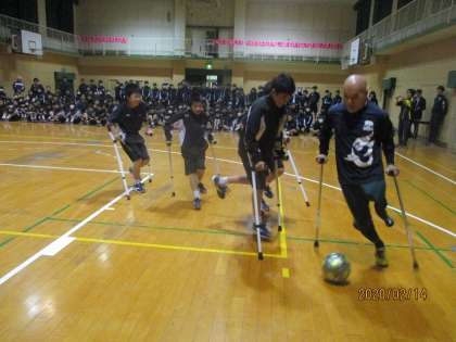 続いて、アンプティサッカーの説明を聞き、少し練習した後、代表生徒がミニゲームを体験しました。