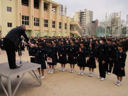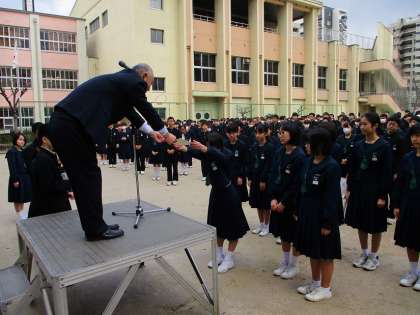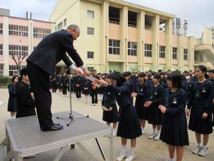 続いて吹奏楽部の表彰です。先日行われた、中学校文化連盟などのソロコンテストで、入賞した多くの生徒の中から、代表者の3名が、校長先生から表彰状を受け取りました。