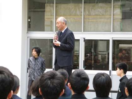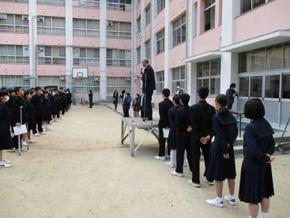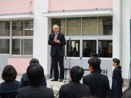 校長講話では、初めに3年生の進路について話をされ「先週、私立高校の入試があり、結果も出ました。皆さんよく頑張った。これから公立高校の特別選抜や一般入試があります。気を緩めず、進路選択に向けてテストまで頑張ってください。」