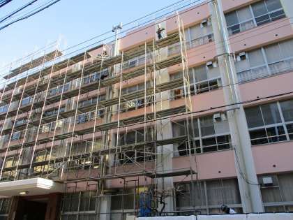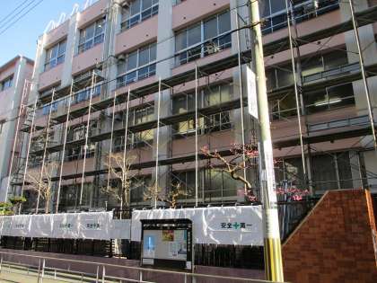 2月17日(月)外壁塗装工事の進行状況です。本館北側の足場のシートも無くなり、先週末から足場の解体も始まっています。明日18日(火)は、グラウンド側の防球ネットを取り付けます。