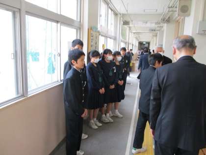 校長室に集まった講師の先生方を、授業前に代表生徒がお迎えに行きました。今回は9会場に分かれて、命・絆・夢を主題とした様々なタイトルの授業を1年生は聞くことになります。