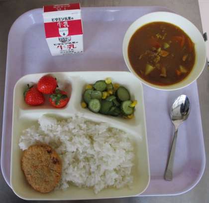 今日の給食の「いちご」は、ビタミンC、カリウム、食物繊維、葉酸等を多く含む果物です。特にビタミンCが多く、100g中に62mg含まれています。給食でいちごを3個食べると、1食分に必要なビタミンCの約70%をとることができます。ビタミンCは、皮膚や細胞のコラーゲンをつくるのに必要なビタミンです。