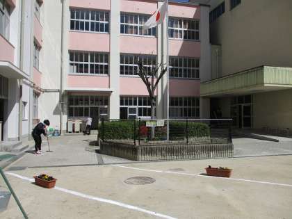 3月12日(木)卒業式の前日は、体育館周辺・校舎内の廊下やトイレを教職員が掃除しました。また、運動場には、駐輪場や花道も設営しました。