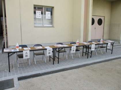 保護者の皆様の受付は、体育館前に各クラスごとに準備しています。必ず受付に寄っていただき、名簿にチェックと参加人数をご記入願います。受付時間は9:10〜9:45です。また、自転車置き場もグラウンド南側に準備しています。ご利用ください。