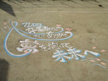 グラウンドには、71期生の卒業生に向けてのメッセージが書かれています。その周りには花道も準備されています。