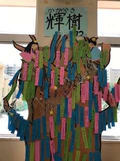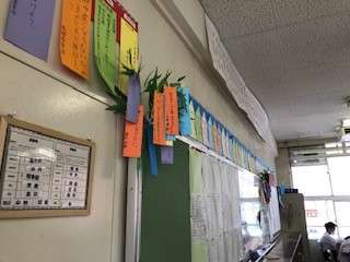七夕に際して各クラスでさまざまな取り組みがありました。3年生は学年フロアの廊下に「輝樹」が登場。それぞれの思いがこもった短冊が掲げられています。教室の後ろに笹飾りを作ったクラスもありました。みんなの願いが必ずかなうといいですね。