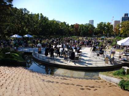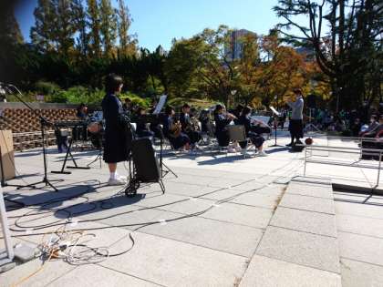 11月14日(土)に靭公園で行われたバラ園コンサートに花中吹奏楽部が出演しました。また、卓球部の生徒が朝の準備に、コンサート終了後の片付けにサッカー部の生徒が手伝いをしました。