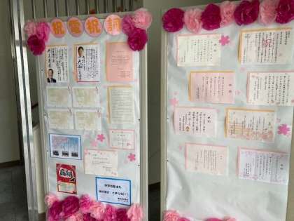校下幼小の先生方や地域各団体の方々におかれましては、残念ながらご来賓としてご臨席いただくことができませんでしたが、たくさんのお祝いをいただきありがとうございました。今後とも新1年生の成長をはじめ、本校教育活動にかかわって、これまでと変わらないご支援・ご協力をよろしくお願いします。