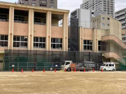 下の写真は体育館の空調機設置工事の様子です。足場が組まれて、室外機は屋上に設置されることになります。6月末には完了する予定です。今夏は涼しく、今冬は暖かい体育館になりそうです。楽しみですね。