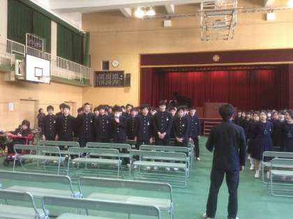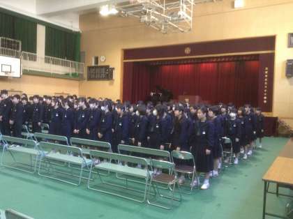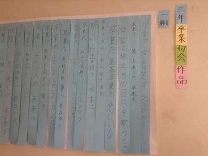 3月10日、1・2限に3年生は、卒業式の練習を本格的に行いました。卒業証書の授与から歌の練習まで。先生方からは、もっと本番を意識して練習しなさいと激をとばされていましたが、こっそりある先生に聞いてみるとなかなか頑張っているみたいですよと言われていました。さすが、3年生、やるときは必ず力を発揮してくれますね。3年教室前には「卒業俳句」が掲載されています。卒業式まであと二日。本番は今以上の力を発揮してくれることでしょう。