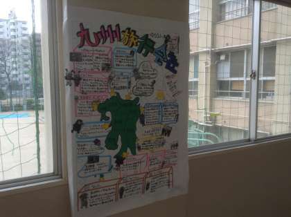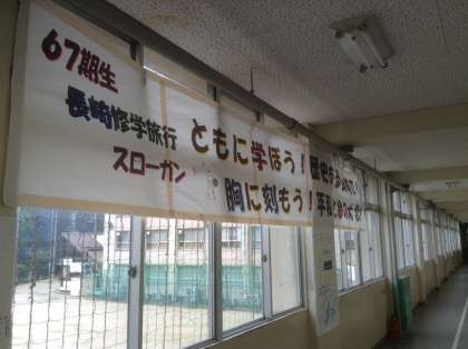 4月14日、3年生は5月10日からの長崎への修学旅行の取り組みが着実に行われています。今は、総合の時間が修学旅行一色です。修学旅行の取り組みの一つにペーロンのクラス対抗戦が企画されているようです。生徒以上に担任が燃えているクラスもありますが。修学旅行のテーマも「命・絆・夢」です。平和学習や友達との絆を深める充実した修学旅行にしましょう。3年の教室前の廊下にはスローガンや学習してきた壁新聞が掲載されています。本当に楽しみですね。