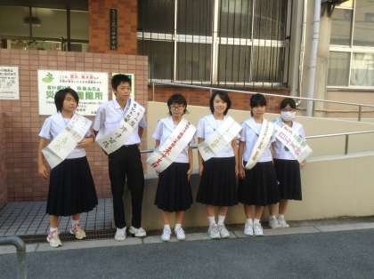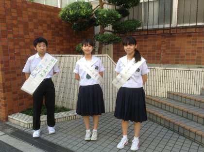 9月9日、「おはようございます。よろしくお願いします」と朝から大きな声で自己アピールをしている9名の生徒たち。いよいよ、9月12日6限に生徒会選挙が開催されます。候補者は、現役の生徒会執行員3名(2年生)と新たに1年生から6名が参加しました。生徒会としてどんなことがしたいですかの質問に1年生の一人が「笑顔がある明るい学校」と答えていました。キーワードの「笑顔」は大事ですね。
