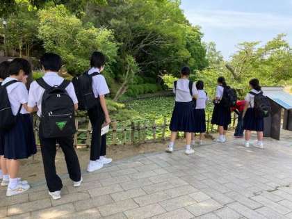 班別体験活動がスタートしました。サイダー絵付グループは道後公園周辺を散策しながらサイダー