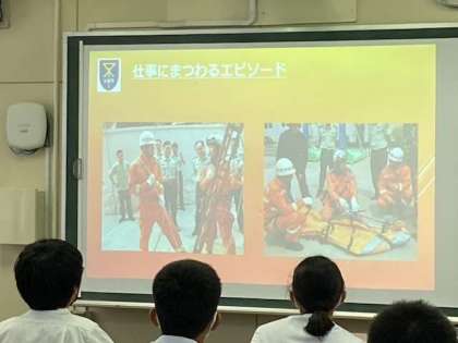 14日(火)の6限目は2年生で職業講話の取組を実施しました。ファッションデザイナーをはじめ、介護士・弁護士・飲食業・レスキュー隊・元プロバスケットボール選手・スポーツトレーナーの7人の講師をお迎えし、それぞれに仕事の内容や体験談などを語っていただきました。皆さんそれぞれのお仕事に誇りをもって一生懸命に働く姿に感動しました。生徒も皆さんも、事前の取組みや当日の講師の方々の案内など、しっかりとできていました。