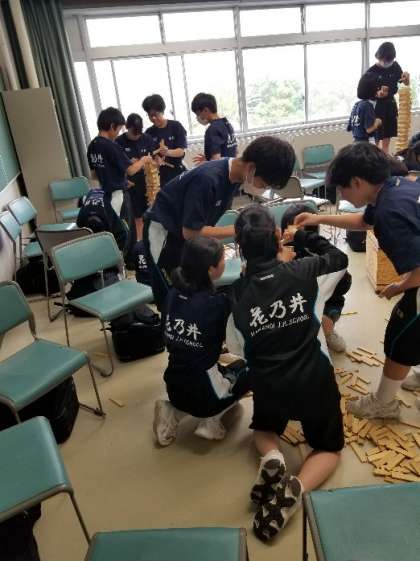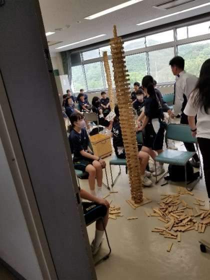 KAPLA(カプラ)という木の札を使用して、見本の写真通りの作品を仕上げることと、KAPLAを積み上げて高さ比べ競争もしました。どのクラスも熱狂しました。