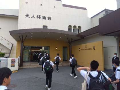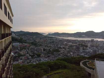 長崎原爆資料館をあとにして、予定より少し早く宿舎「矢太樓南館」に到着しました。坂の街の魅力を活かした建物は、入口が9階で部屋に下がっていくスタイルです。生徒たちからは、宿舎に入った瞬間の景色に歓声があがっていました。