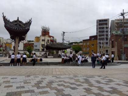 フィールドワークが終了しました。ゴール地点が湊公園の活動班が徐々に集まってきました。どの班も集合時間に遅れることなく集合できました。バスに乗車した途端に雨が降り出しました。