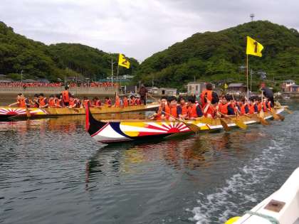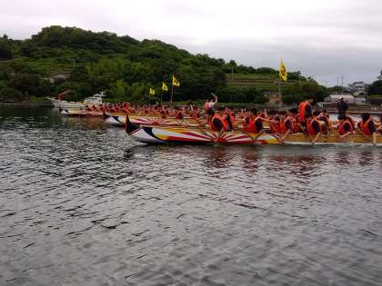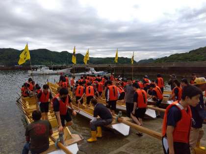 ペーロン体験のつづきです。学級を2班に分け、合計10チームで予選と順位決定戦を行いました。太鼓のリズムとかけ声に合わせてオールを合わせます。