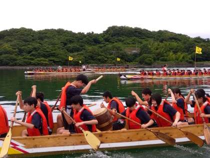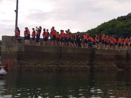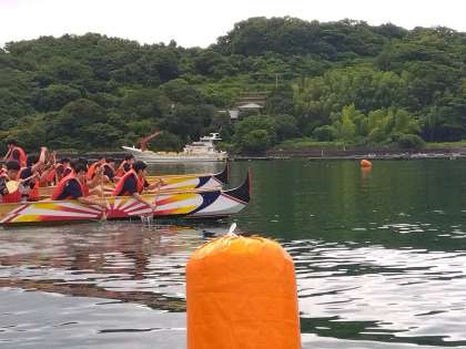 防波堤から仲間の声援をうけて、オールを漕ぐ手に力が入ります。