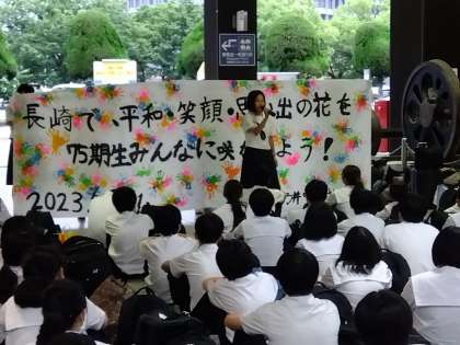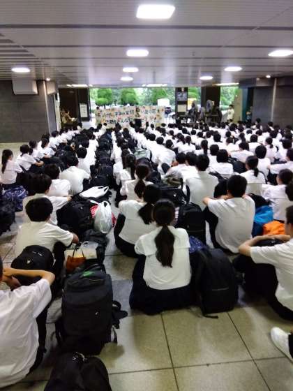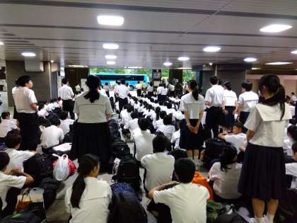 新幹線は予定通りに到着し、新大阪駅で解散式を行いました。校長先生の講評のあと、生徒代表の挨拶があり、実行委員会やカメラマン、添乗員の皆さんへの感謝を伝えて全員が関わるプログラムを終えました。この後は、方面別のバスに分かれて乗車し、帰路につきます。
