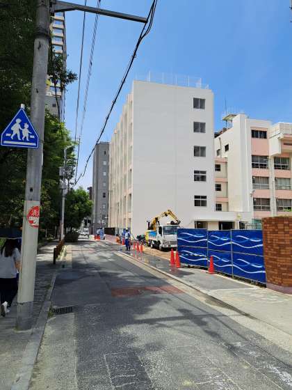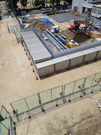 工事現場の様子です。左の写真は校舎4階から撮影しました。下方のフェンス内では手洗い設置工事が進行中です。右の写真は敷地南側です。工事現場を囲っていた鋼板塀・工事車両のゲートが撤去されました。