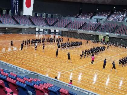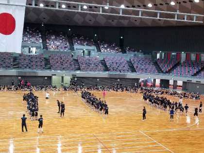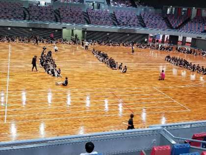 プログラム4番、1年学年種目(大縄跳び)の全体の様子です。最も多く跳んだ第1位は4組でした。