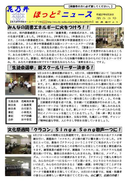 本日9月28日(月)に「花乃井ほっとニュース第53号」を配布しました。