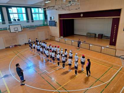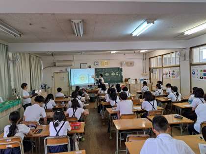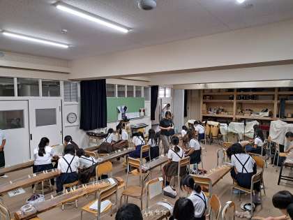 上から、保健体育〔中学生に向けて集団行動を身につけよう!〕、美術〔色鉛筆マスターを目指して〕、音楽〔箏で「さくら さくら」を演奏しよう!〕の授業の様子です。