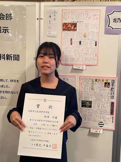 大阪市立中学校総合文化祭の「社会部門」で、本校の2年生の中澤さんが見事に優秀作品を受賞されて、開会式において表彰されました。おめでとうございます!