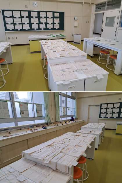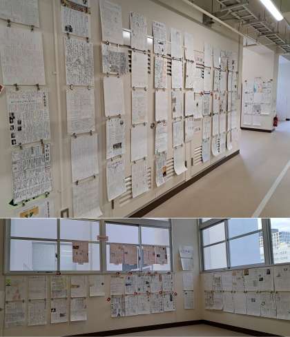 新校舎5階には、1〜3年家庭科のスウェーデン刺繍、食事・幼児のおやつのレシピ(夏休みの課題)、おもちゃ制作計画、家庭科部員の作品、歴史新聞(2年社会)、理科部の作品「目の不思議〜モザイクアート」、社会科部とチャレンジ講座(社会)のレポートが展示されていました。