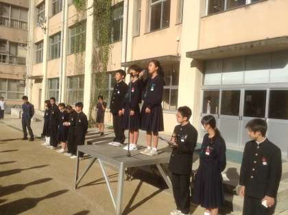 10月26日、全校集会の開始は8時25分からですが、8時23分ごろには全校生徒の集合整列ができています。校長先生からは、10月27日が「文字・活字文化の日」であり、この日から11月9日までが秋の読書週間であるというお話がありました。また、本校の全校生徒の8割が「読書の習慣化ができている」とアンケートで答えています。そして、ある新聞のコラムから「彼女の心を開いたのは1冊の本のある1行との出合いでした」という記事の紹介がありました。みなさんも本や人との出合いで学ぶことがありますね。1年生は10月27日が「パラリンピックキャラバン」、2年生は10月28日・29日と職業体験があります。この取り組みを通して、多くの学びや感動があるはずです。本や人、出来事の出合いを大切にしていきましょう。