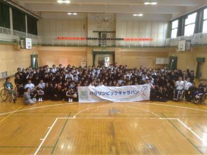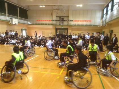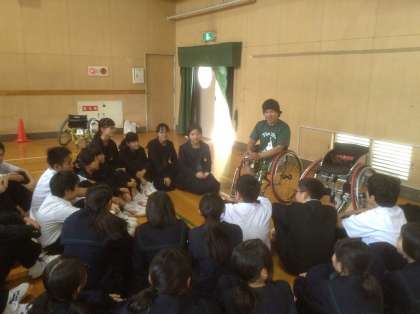 10月27日、1年生対象に体育館で5・6限に「パラリンピックキャラバン」を実施しました。講師6名に来ていただき、全体での講話、車いすバスケット体験、グループに分かれてのQ&A学習と多岐に渡った学びの場を提供していただきました。交通事故や転落事故、プールでの飛込み事故で車いす生活になるが、できないことを数えるよりできることを数えようの精神で、困難な状況を打開していくという力強い生き方を学びました。できないではなくどうすればできるようになるかを考えることは本当に大事なことだと生徒も学んだと思います。関係者の皆様、ありがとうございました。また、昼休みには、2年、3年にもかかわっていただき重ねてお礼申しあげます。