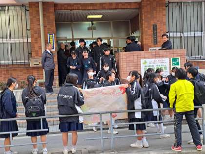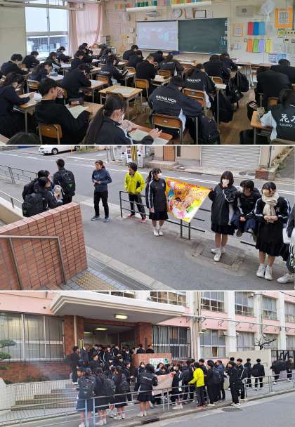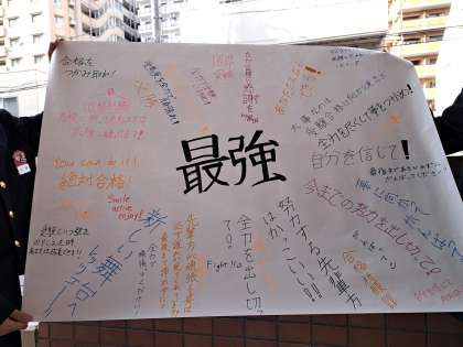 3年生を激励するために、生徒会役員のみなさんが玄関に集まり、下校する先輩にエールを送っていました。3年生のみなさんが、持てる力を精一杯発揮できるよう、応援しています。