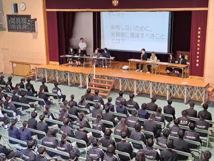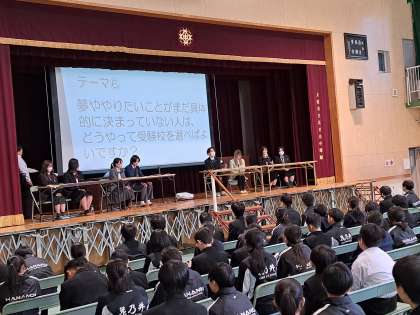 2年生の進路学習の一環として、3月11日に「卒業生の話を聞こう」を開催しました。写真はパネルディスカッションの様子です。