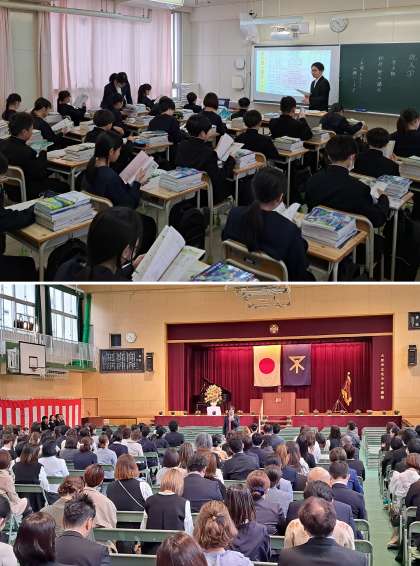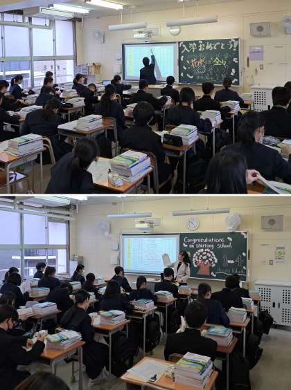 入学式後、各教室に戻り、学級活動を行いました。写真は、給与された教科書を確認しているところです。同じ時間帯に、体育館では新入生保護者説明会を実施しました。お子様を通じて、いろいろな書類用紙を配付しています。お手数ですが、期日までに作成・提出いただきますよう、お願いいたします。