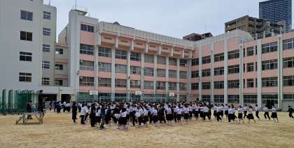 教室にいるときに地震が発生した際の身を守る方法、安全確認と運動場への避難、津波の到達を想定した上層階への避難の手順を確認しました。