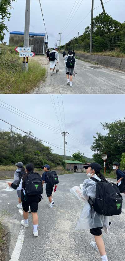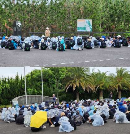 午後の活動の様子です。1・2・4組の謎解きハイキングの一コマです。小雨の中でのスタートなので雨具持参です。