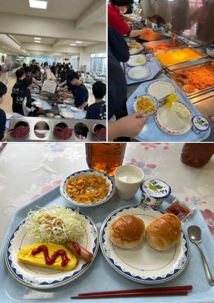 朝食の時間です。おいしくいただきました。ラジオ体操と食事で、しっかり目覚めました。夕食とおなじカフェテリアスタイルで、メニューは、ご飯、みそ汁、パン、コーンフレーク、ウインナー、オムレツ、生野菜、ポテトサラダ、納豆、ヨーグルトです。