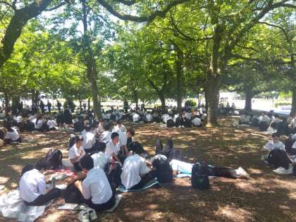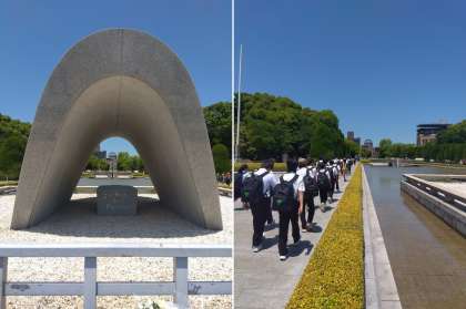 昼食の後、広島平和都市記念碑(原爆死没者慰霊碑)前を通り、原爆の子の像の前に移動しました。