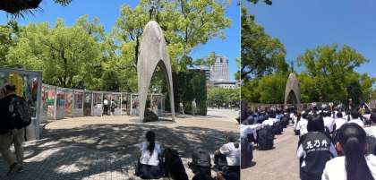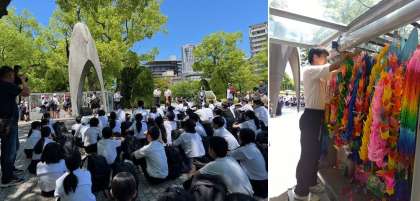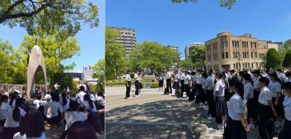 「原爆の子の像」の前で平和セレモニーを行いました。代表生徒が「平和宣言」を読みあげ、千羽鶴の奉納、黙祷を行い、平和への誓いをあらたにしました。