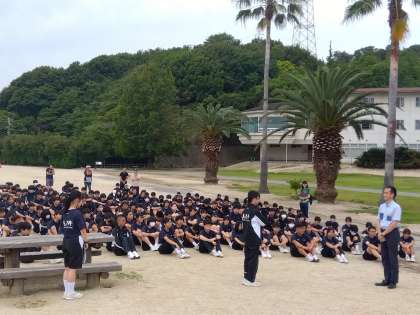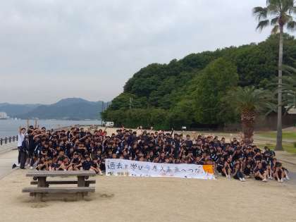 午前の活動の締めくくりに、全体写真を撮影しました。続いて、退館式を行い、一泊目をお世話いただいたお礼を伝えました。