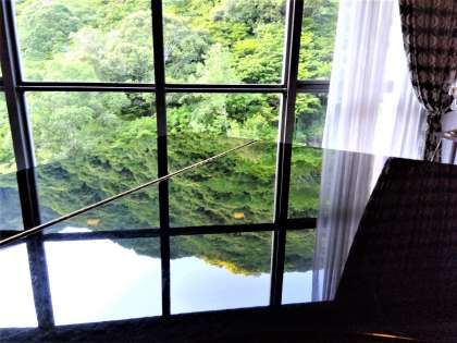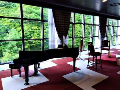 ピアノに映る青もみじが鮮やかです。