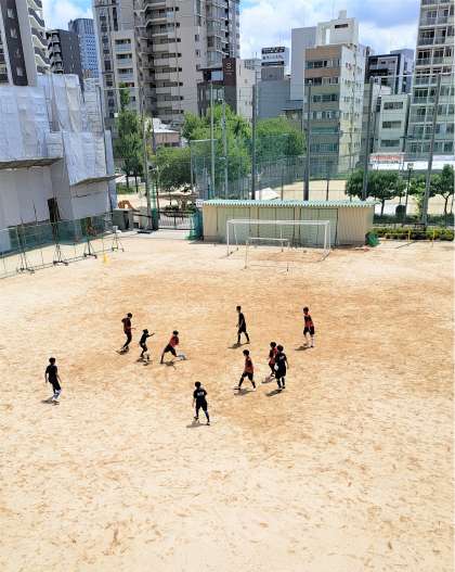 サッカー部の練習の様子です。運動場を使用する部は、狭い場所で工夫しながら活動しています。