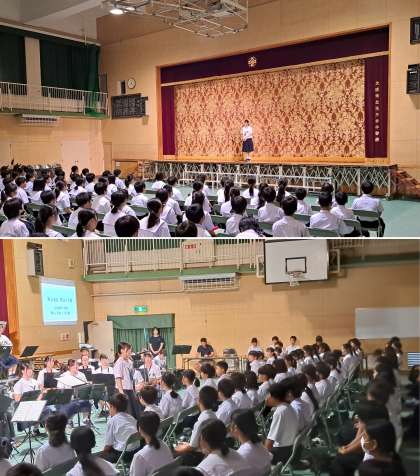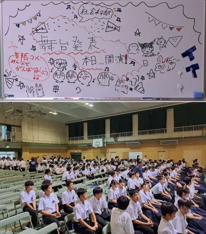 1日目は、1・2年生が文化部(社会科部、理科部、吹奏楽部)の舞台発表鑑賞、3年生が展示見学です。